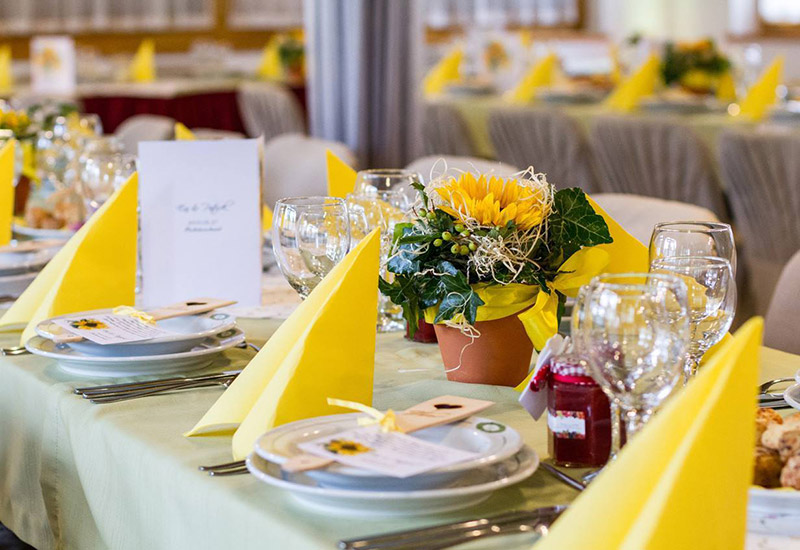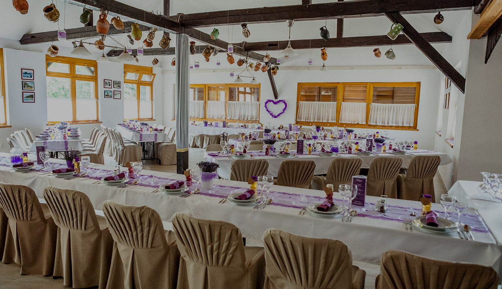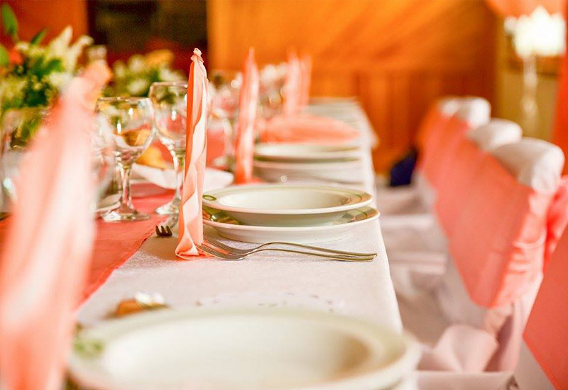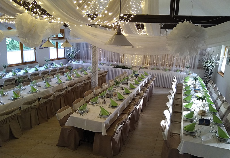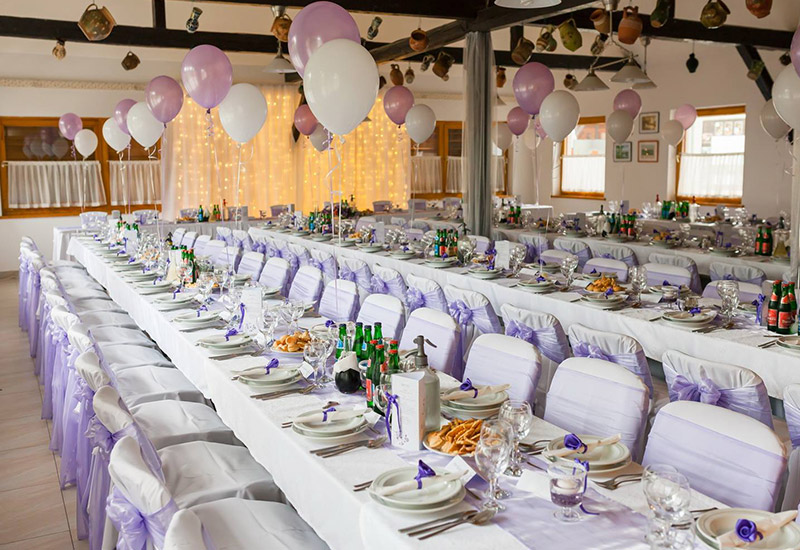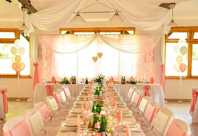 asztali dekorációk, székszoknya, asztalszoknya, a főasztal mögötti falat teljes hosszában beborító exkluzív függöny fényfüzérekkel, különlegesen látványos mennyezeti dekorációval.